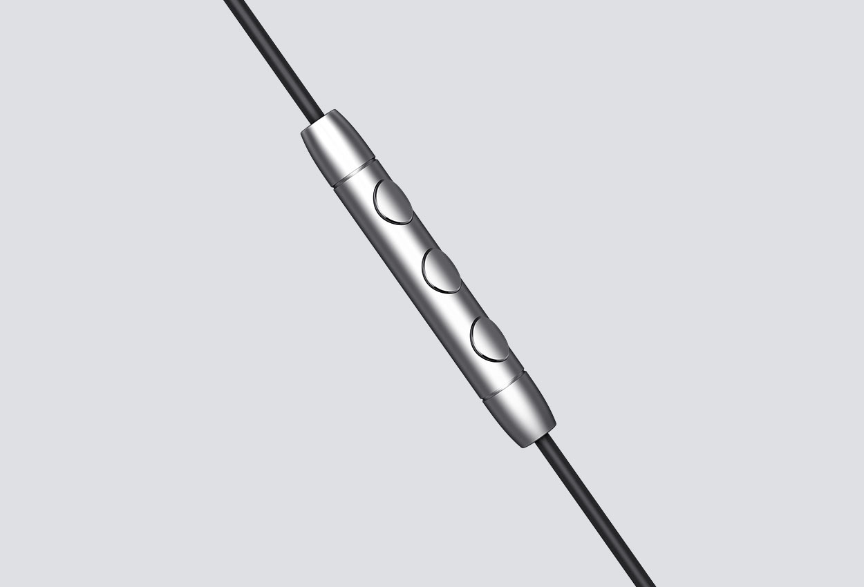 イヤホン全体のデザインからインスピレーションを受け設計さたマイクコントローラー。1番触れる部分だけに金属のコーティングをし、伸縮性のあるマットワイヤーで裏打ちすることで、「持つ喜び」をより高めています。