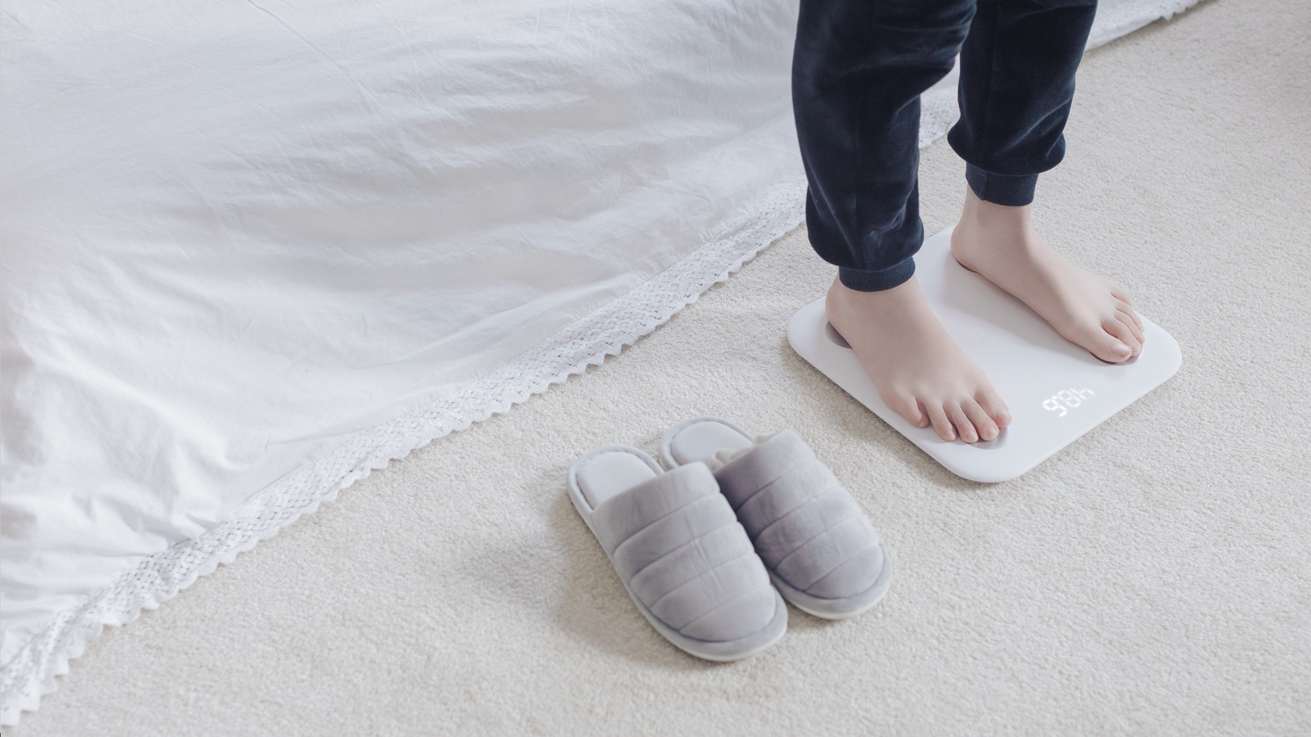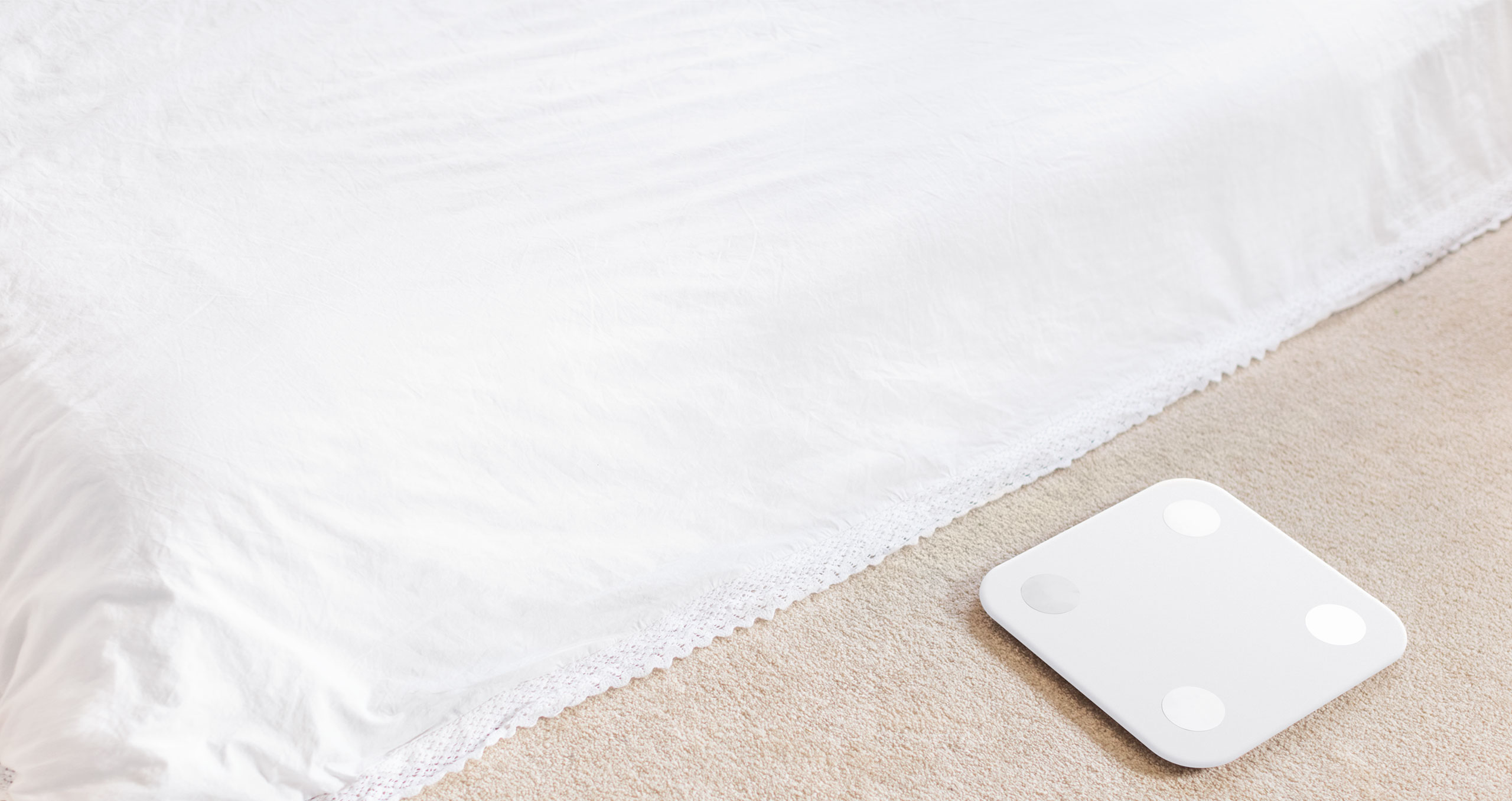 シンプルで洗練されたピュアな白の体脂肪計。簡単に体重測定と脂肪測定ができます。