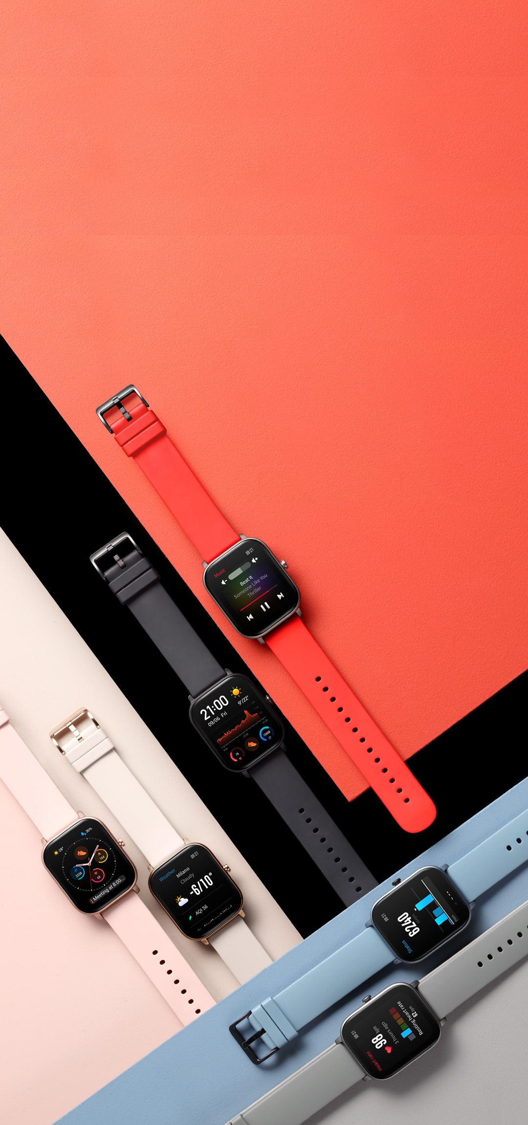 Amazfit GTS はチタンバージョンとアルミニウム合金バージョンの2つのバージョンがあります。チタンバージョンは時計本体からボタン、バックルまでがチタンで作られています。フッ素ゴムのベルトを採用、絶妙で豪華、そして質感に優れています。アルミニウムバージョンは、スタイリッシュな6色展開。 時計本体は小型軽量で厚みはたったの9.4mm、スムーズな2.5D曲面ガラスを採用、どちらのバージョンもお好みでお選びください。