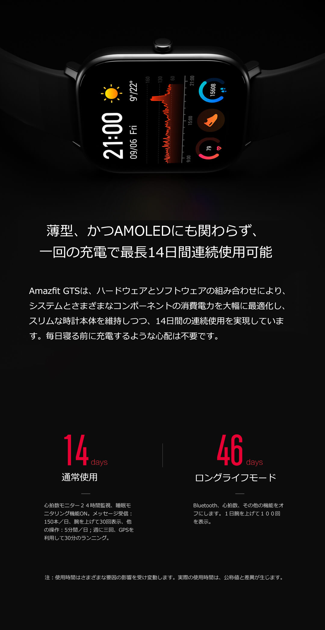 心拍数モニターが24時間監視、睡眠モニタリング機能を搭載。メッセージ受信:150本/日、腕を上げて30回を表示、他の操作:5分間/日;週に三回、GPSを利用して30分のランニングの場合